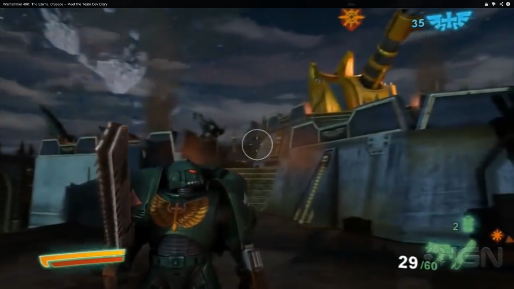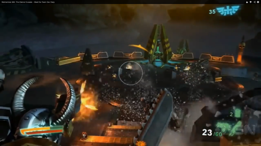 Hi guys, in fashion of the Rewind Theater videos that IGN does, I decided it would be fun to fully analyze the contents of the video that the dev team recently uploaded showing their studio, what they're working on and out first sneak peak of the gameplay. Disclaimer: As the devs mention repeatedly, this is still a work in progress, and what's been shown does not necessarily have to make it into the final product. Also, please excuse the poor resolution. With that out of the way, let's start with this pic: http://i3.photobucket.com/albums/y93/Asurael/CharacterSelection-LoadoutSelection.png Here we can see something Nick (Lead UI Designer) was working on, which looks a lot like a Character Selection screen or a Loadout Selection screen. Not much can be seen of it but maybe this is a start to what was mentioned that the UI will be designed to match the faction you're playing. Following up we can see this nice piece of artwork: http://i3.photobucket.com/albums/y93/Asurael/DarkReaper.png So artwork should not be taken as confirmation of anything, but of course it would make sense that Dark Reapers would be one the Eldar's playable classes, filling the role of heavy support, and this artwork seems to back this up. I'm not sure if the front of the launcher has been cut by the screen or if this is another weapon, but for the most part it seems to be a regular Reaper Launcher. Then we get to see more artwork on the fullscreen: http://i3.photobucket.com/albums/y93/Asurael/Heroes-Farseer.png Other faction artwork pieces were shown, but this own caught my eye as it suggests what hero classes we might get to see, and as I said earlier, artwork should not be taken as confirmation of anything, but the Farseer seems to suggest the obvious inclusion of this unit into the game, likely as a Hero class. Then we get a sneak peak to the design process of the level where we see the gameplay: http://i3.photobucket.com/albums/y93/Asurael/LevelDevelopment.png This is the same stage that the team was play-testing later in the video, as can be evidenced by the Fortress of Retribution shown on the lower side of the screen that's seen later in the game, as well as the ominous castle in the distance. This seems to suggest to me that the Fortress if SM territory, mayb Dark Angels specifically given the Fortress. And so the ominous castle to the distance could probably be Chaos SM territory, if so, then frontlines will be much tighter that I originally expected. Then we finally make it to the Gameplay: http://i3.photobucket.com/albums/y93/Asurael/LandingCrosshair.png Of course, at first we get to see some gameplay from the point of view of an Assault Marine. In this screen, we can notice a bit about how the UI might work for jump units. After a massive jump, you get to see a crosshair that lets you know where you're going to land, allowing you to correct your course as your are falling, similar to what can be seen in the game "Space Marine". Here we get to see some damage in action: http://i3.photobucket.com/albums/y93/Asurael/DamageUI.png People have wondered about how health was going to be displayed and what damage is going to look like. This part of the video seems to suggest that you do get a health bar along with a "shields" bar, and your screen will start flashing brighter the more damage you receive, most likely until you die or stop to recharge your shield. This is also in line with modern shooters and the gameplay of "Space Marine". Now we see the full UI in action: Here we get a better look at the health and shield bar, most likely having the red bar for health and the yellow bar for shields. We also see that there's a cross-eye, but whether that's there permanently or to help the devs is unknown. At the bottom right corner you get to see your equipped weapons (in this case a Bolt Pistol and a Chainsword), as well your remaining Ammo and available Grenades. In this part of the video you actually get to see this CSM run out of ammo, at which point he opts to go full melee, most likely because he didn't have any other choices, meaning that he needs to find a point where to reload and find more ammo. Also, at the top right corner there's an Aquila-like symbol with a number, which corresponds to your team's remaining lives. Given the number of lives shown, it's likely that the limit is set for Squads. At the bottom left, over your health bar, you also get to see recent kills by other players, and whether they've been executed or kill the old fashioned way. Throughout the playthrough you also see moving Chaos eight-sided stars moving along the edge of the screen marking where your friends are, and when you're close enough, the objective will also be marked. Up next, we get a good look at the Drop Pods: http://i3.photobucket.com/albums/y93/Asurael/DropPods.png Now we've known that players would be able to drop into the action by means of Drop-Pods (or whatever other means other factions use), and this seems to indicate players can be placed right into the action. In fact we see another drop-pod in the distance, suggesting multiple points of entry. However, we don't know how these would work in an ongoing battle and whether their landing points are predesignated (most likely they are). And a nice little Cannon for show: http://i3.photobucket.com/albums/y93/Asurael/ChaosControlledCannon.png Here we get to see what looks like an AA cannon currently being held by the Chaos SMs. This seems to suggest that objectives have practical effects on the battlefield. Also, during the AMA it was asked if players would get to use these, and it was confirmed that they would, but how that would be done was still being figured out. Victory! http://i3.photobucket.com/albums/y93/Asurael/Victory.png Another victory for the Imperium. The illegible text beneath probably describes the conditions of this victory, but the fact that you get a victory screen seems to suggest that battles will work by means of consecutive "matches", where eith